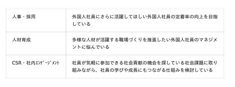 - 社員ボランティアとしての参加が可能- 異文化理解、語学力、コミュニケーション力育成