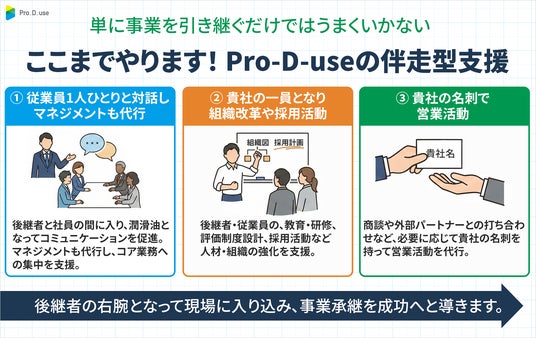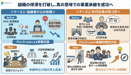 中小企業向け経営コンサルティングを提供する株式会社Pro-D-use(本社:東京都新宿区、代表取締役:小笠原 亮太)は、事業承継支援の需要拡大に伴い、2026年2月より新たに現場介入型の「組織承継専門チーム」および、すでに他社で支援を受けている企業向けの「セカンドオピニオン窓口」を新設いたしました。