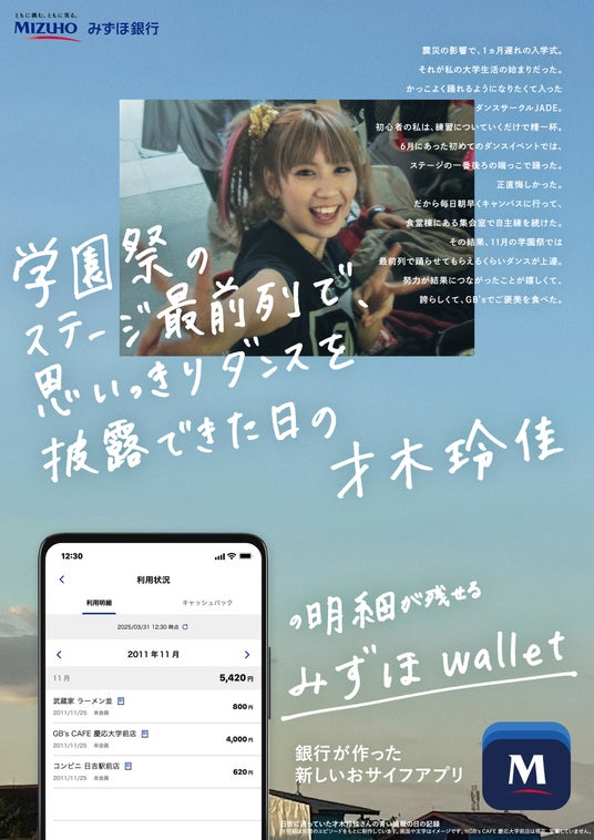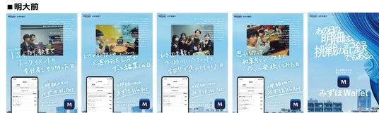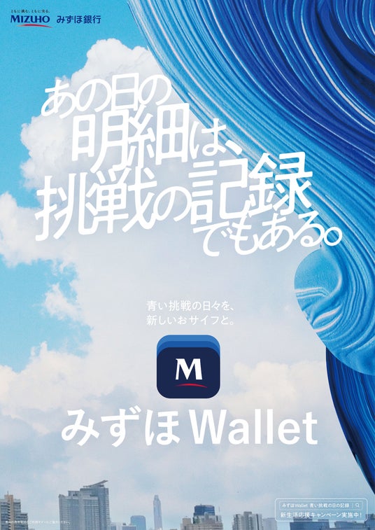 株式会社みずほ銀行(取締役頭取:加藤 勝彦、以下「みずほ銀行」)は、「すべての青い挑戦に、かつてない追い風を。」をテーマに、新生活を迎える方々の“青い挑戦”を応援する新生活応援キャンペーンを2月3日(月)より開始しています。このたび、皆さまの様々な挑戦をさらに後押しできるよう、4大学の学生・OBの方々にご協力いただき、自身の挑戦にまつわるエピソードを決済アプリ「みずほWallet」の利用明細とともに振り返る、ユニークな交通広告「青い挑戦の日の記録」を、2025年3月31日(月)~4月13日(日)の期間、早稲田大学・上智大学など4大学の最寄り駅に展開いたします。