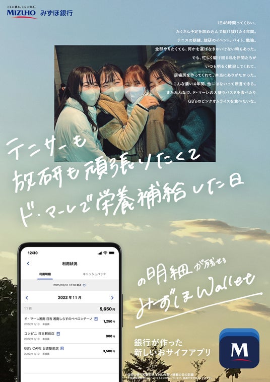 学生たちの思い出深い挑戦エピソードを、決済アプリ「みずほWallet」の利用明細で振り返る「青い挑戦の日の記録」が3月31日より都内4大学エリア(駅)に登場
