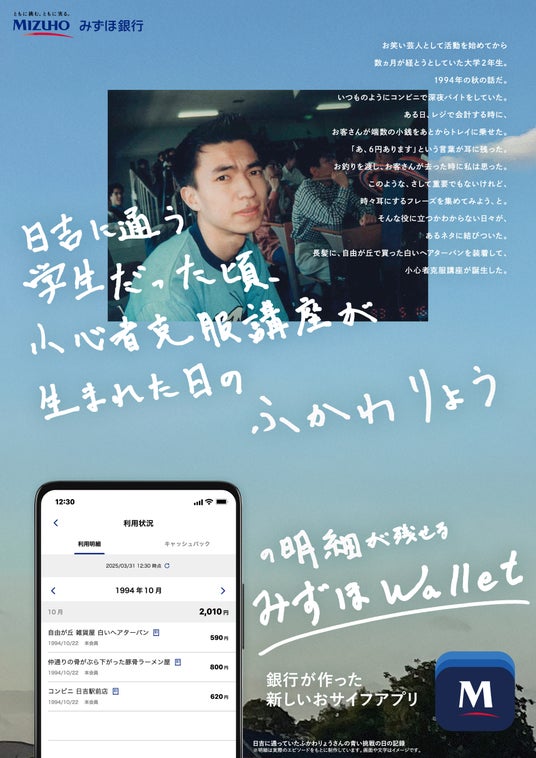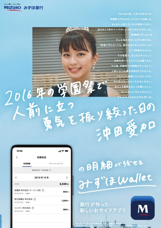 そしていよいよ本格的な新生活時期を迎える中、期待と不安を抱えながら学生生活のスタートをきる新入生をはじめ、多くの人々のこれからの新しい挑戦にそっと後押しができればと考えております。誰しも新しい一歩を踏み出す時、勇気がいるものです。その踏み出しには、かつての先輩方の挑戦のエピソードがきっと励みになります。その挑戦の日の記録を、「みずほWallet」の特徴の一つである「利用明細」にフォーカスし、当時買ったもの、食べたものの思い出とともに振り返ります。これに共感し、刺激され、自分も思い切って新しいことにチャレンジしていこう、と少しでも多くの人のきっかけになればと願い、企画しました。