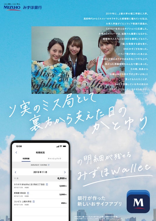 上智生であることは公表していましたが、ミスコンの運営をしていたことはあまり公表していなかったのでこれを機に私の大学生活を少しでもイメージしてもらえたら嬉しいです!また私もみずほ銀行のユーザーなのでこのような機会をいただけて嬉しいです、これからも愛用します!みずほ銀行最高!