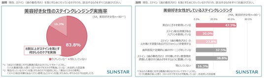 美容好き女性に対し、ステインクレンジングに関する設問をしたところ、約8割(83.8%)が何かしらのステインを落とすためのケアを実践していることが分かりました。また、9割以上が毎日の歯みがきでステインクレンジングを意識し、約半数が美白ハミガキを使用するほか、4割近くが歯科医院で定期的に歯のクリーニングをしていることが分かりました。