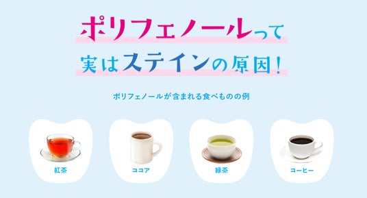 歯の着色や変色の原因は一つではありません。加齢によって歯が黄ばんでくることがありますが、それは歯の内側から起こる「歯の変色」です。一方、コーヒーやお茶、赤ワイン、カレーなどの飲食物に含まれる色素が歯の表面に付着・蓄積して生じるのは、外側から起こる「歯の着色」です。こうした飲食物やタバコなどの嗜好品が原因で外側から生じる着色汚れを“ステイン”と呼びます。例えば、紅茶に多く含まれるタンニンはポリフェノールの一種で、歯の表面の成分と結びつきやすく、さらに唾液中のミネラルと反応することで褐色の着色を形成します。時間の経過とともに酸化が進むと、より取れにくくなるのが特徴です。