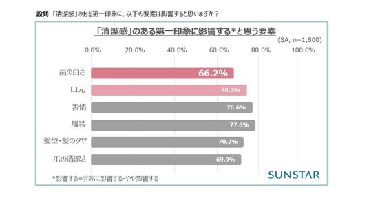 清潔感のある第一印象に影響する要素について質問したところ、「歯の白さ」が影響すると回答した人は約3人に2人(66.2%)となり、多くの人が歯の白さが初対面の印象の重要な要素として捉えていることが分かりました。