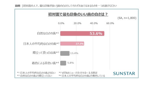 初対面で最も印象がいい歯の白さを問う設問では、「自然な白さの歯」と回答した人が53.6%と最も多く、「際立って真っ白な歯」よりも「歯本来の持つ自然な白さの歯」に良い印象を持つ人が多い結果となりました。「自然な白さの歯」を回答した理由として「健康的に見える」「自然体で好感度が持てる」が多く挙げられたことから、一人ひとりがもつ歯本来の美しさである自分らしい歯の白さに好感を持つ傾向があることも分かりました。