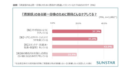 清潔感のある第一印象のために普段から意識して行っているケアを質問したところ、約4割がフケのケア(37.3%)や髪のツヤのケア(35.0%)、肌の保湿ケア(43.9%)を実施していましたが、ステインを落とすためのケア(ステインクレンジング)の実施はわずか2割以下(19.4%)という結果となりました。初対面の印象で歯の白さが大事であると認識しているにもかかわらず、自然な歯の白さを保つためのケアは本来の肌や髪の美しさを保つためのケアと比較し、実践している人はまだ少数という現状が分かりました。