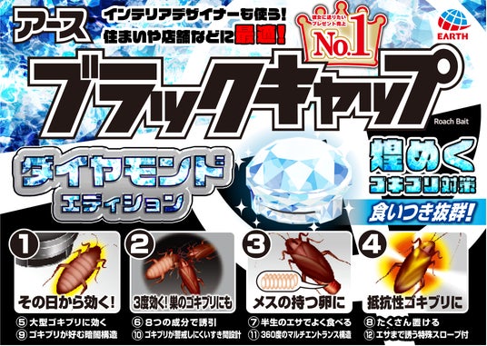 アース製薬株式会社(本社:東京都千代田区、社長:川端克宜、以下 「アース製薬」)は4月1日(火)に、ゴキブリ駆除剤「ブラックキャップ」の新たな進化形として、世界で最も煌めくブラックキャップ『ブラックキャップ ダイヤモンドエディション』を発売しました。