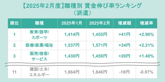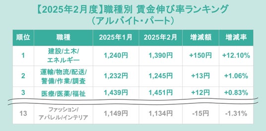求人サイト主要9媒体から雇用形態別に分析!アルバイトでは建設系が前月比+12.10%で1位【2025年2月度 職種別 賃金伸び率ランキング】