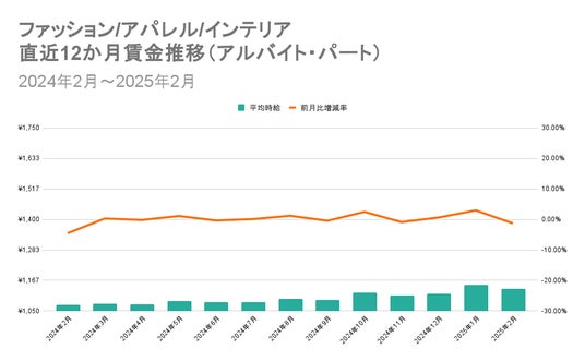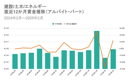 1位の「建設/土木/エネルギー」と13位の「ファッション/アパレル/インテリア」における直近12か月の賃金推移を比較すると、2025年1月度のランキングで最下位だった「建設/土木/エネルギー」の賃金はV字回復を見せました。複数の企業が建設現場における高時給案件を多数出稿したことが影響しています。