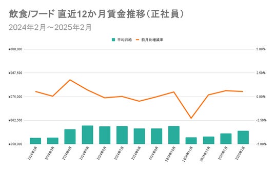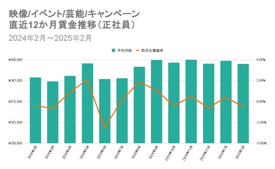 2025年1月度から2ヵ月連続で1位の「飲食/フード」と17位の「映像/イベント/芸能/キャンペーン」の直近12か月の賃金推移を比較すると、「飲食/フード」の賃金は2024年3月から5月にかけて、飲食チェーンを運営する特定企業の集中出稿によって増加。10月から11月にかけては、飲食チェーンを運営する複数企業の求人掲載の終了により減少しました。それ以外の期間において大きな増減は見られず、前月比増減率はほぼ0%のラインを横ばいで推移しています。