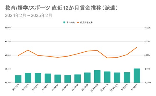 1位の「教育/語学/スポーツ」と11位の「建設/土木/エネルギー」における直近12か月の賃金推移を比較すると、「教育/語学/スポーツ」は2024年2月から3月、同年8月から10月、2025年12月から2月にかけて賃金が上昇傾向にありました。