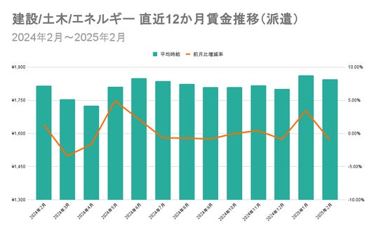 2025年1月度のランキングで1位だった「建設/土木/エネルギー」は、2025年1月から2月にかけて時給1800円未満の求人数が増加したことにより、平均賃金が低下し最下位となりました。