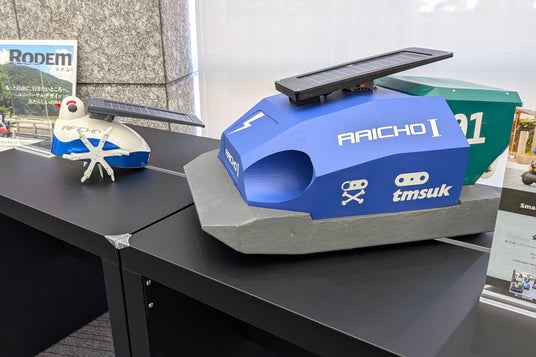 農業用ロボット「雷鳥1号」は、棚田や小規模圃場など、農地や経営規模の大規模化が図りにくい中山間農地の稲作を維持するために、省力化を最優先として多少の収量低下は許容するコンセプトで開発したものです。展示している雷鳥1号は、足ヒレで水を濁らせ、雑草の光合成を抑えることで、水田内の雑草繁茂を抑える雑草抑制モデルと、播種(種まき)や肥料・農薬散布を行うことができる播種対応モデルです。ソーラーパネルで発電し、日照があるときに稼働します。