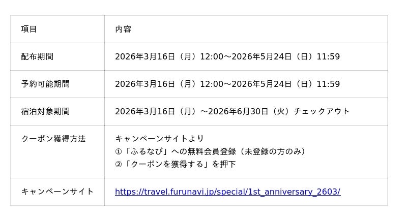 ふるさと納税サイト「ふるなび」を運営する株式会社アイモバイル(本社:東京都渋谷区、代表取締役社長:野口哲也、東証プライム市場)は、旅行予約サイト「ふるなびトラベル予約」にて、サービス開始1周年を記念したキャンペーンを2026年3月16日(月)12:00より開始いたしました。期間中は先着1,000予約限定で、初めて「ふるなびトラベル予約」をご利用する方は最大30%OFF、ご利用経験のある方も最大15%OFFで予約できるクーポンを配布し、春休みやゴールデンウィークに向けた宿泊予約を応援します。