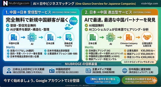 株式会社ニュウジア(本社:東京都中央区、代表取締役:柏口之宏、以下「ニュウジア, NIUSIA」)は、2026年 3 月16日より、AI を活用した日中ビジネスマッチングプラットフォーム