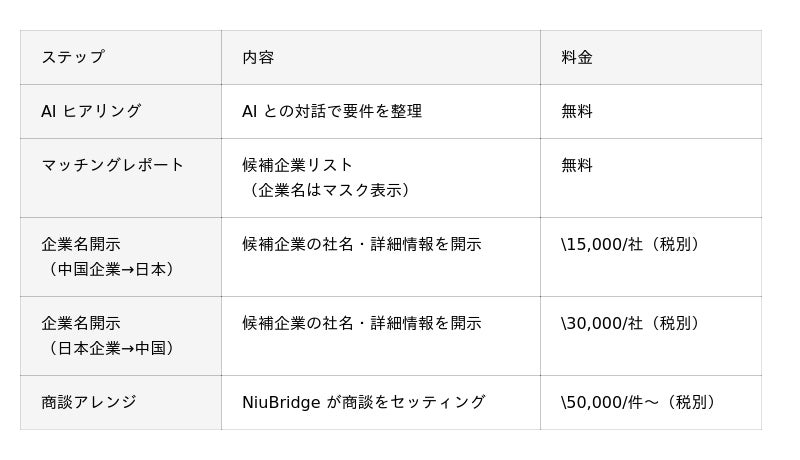 一方、JETRO などの公的機関は無料ですが、AI を活用したマッチング機能や中国語によるセルフサービス対応は提供されていません。