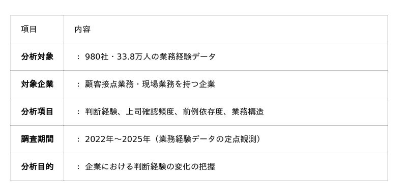 組織行動科学(R)を提供するリクエスト株式会社(本社:東京都新宿区、代表取締役:甲畑智康)は、企業における判断経験の変化について分析した調査結果を公開しました。本分析は、980社・33.8万人の業務経験データを対象に実施したものです。