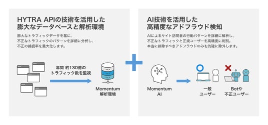 近年、生成AIの急速な発展と普及に伴い、Botや不正ユーザーによる広告クリックの水増し、それに伴う広告費の不正利用が、広告業界全体で深刻な問題となっています。この状況を受け、モメンタムは長年培ってきた高度な解析技術を活用し、アドフラウド対策に特化した「HYTRA HORNET」を開発。広告費の流出を防ぎ、広告価値の最大化につながる環境を提供します。
