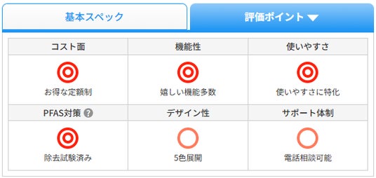 - 多角的で透明性の高い評価項目:「コスト」や「機能性」「デザイン性」だけでなく、「使いやすさ」「サポート体制」「PFAS対策」など、計6つの評価項目を設定。各項目に対し、「◎⚪︎△」の評価と評価理由を明記し、透明性の高い情報を提供します。