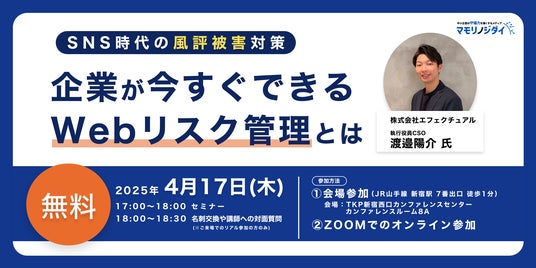 中小企業の守備力を強くするメディア『マモリノジダイ』を運営する株式会社スリーエーコンサルティング(代表取締役社長:竹嶋 寛人)は、4/17(木)17:00よりSNS時代の風評被害対策特別セミナー「企業が今すぐできるwebリスク管理とは」を開催します。