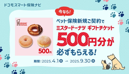 「ドコモスマート保険ナビ」(https://hoken-navi.docomo.ne.jp)を提供する株式会社ドコモ・インシュアランス(本社:東京都中央区 代表取締役社長:吉村忠義)は、ご好評につき2025年3月31日(月)まで実施していたドコモスマート保険ナビでペット保険を新規ご成約いただいたお客さま全員を対象とした『ペット保険で安心!新規のご契約でもれなく「ミスタードーナツ ギフトチケット(500円)」プレゼントキャンペーン』を、キャンペーン期間を2025年4月1日(火)~2025年9月30日(火)として継続実施することを決定いたしました。