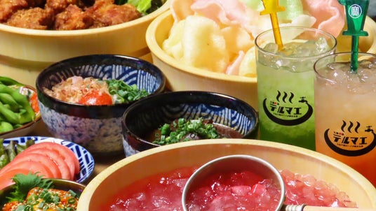 料理は70円(税抜)からご準備。思わず写真や動画が撮りたくなるようなオリジナルロゴグラスや風呂桶をモチーフにした飲み放題専用桶でご提供。