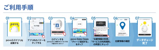 「未来の都市」館内または「ローソン大阪・関西万博店」店内でpovo shopへアクセスし、povo2.0のIDでログインしてください。位置情報で来店状況を確認後、0.5GB(24時間)が即時で追加されます。