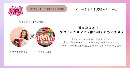 プロテイン=筋トレのイメージを超え、美容・健康・ライフスタイルの一部として楽しむためのイベントです。各分野の専門家によるトークショーやワークショップ、試飲・試食体験ブースを通じて、楽しく学びながら美と健康をアップデートできます。