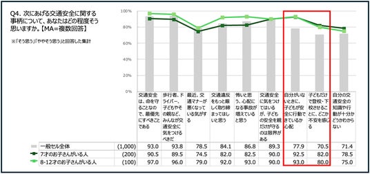 特に、小学生の子どもを持つ親の多くが、「自分がいないときに、子どもが安全に行動できているか不安(約9割)」「子どもだけで登下校させることにどこか不安を感じる(約8割)」といった思いを抱く、結果となりました。