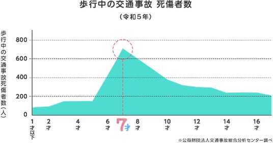 小学校にあがり行動範囲が広がる7才児は、大人よりも目線が低く、まだ十分に注意力が育まれていないために、歩行中の交通事故による死傷者数が突出して多いというデータがあります。(公益財団法人交通事故総合分析センター調べ)