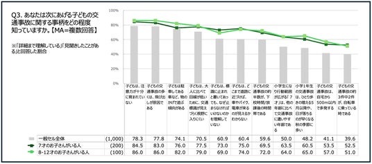 例えば、「飛び出し」や「子どもの注意力がまだ十分に育っていないこと」については、約8割が認識しており、多くの人が事故要因として理解している反面、今回のプロジェクトとも関連する「7才は他の年齢に比べて、交通事故に遭いやすい年齢である」 という事実については、認知している人は50.0%となり、(年長・小学1年生を含む)7才のお子さんがいる人でも、63.5%にとどまりました。