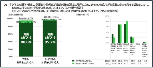 実際に、「見守り活動が実施されている」と答えた7才のお子さんがいる人は88.8%、8-12才ののお子さんがいる人は95.7%と、ほとんどの学校で「こども見守り活動」が実施されていることがわかりました。その実施者については、保護者や地域のボランティアが活動を行うケースが約6割以上という結果となりました。