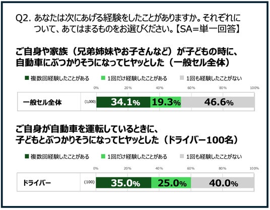 53.4%が「自身や家族(兄弟姉妹やお子さんなど)が子どもの時に、自動車にぶつかりそうになってヒヤッとした」と回答。また、ドライバー100名の60.0%が「子どもとぶつかりそうになってヒヤッとした経験がある」と回答しており、リスクが“身近なもの”として存在する実態が浮かび上がりました。