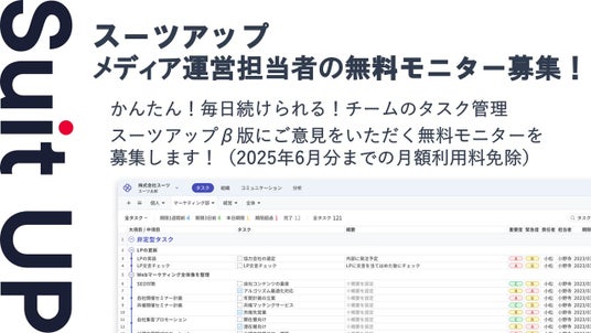 株式会社スーツ(所在地:東京都千代田区、代表取締役社長CEO:小松 裕介)は、チームでかんたん、毎日続けられるプロジェクト・タスク管理ツールの経営支援クラウド「Suit UP」(スーツアップ)において、企業のブログ、YouTubeやSNSなどメディア運営担当者の無料モニターを募集いたします。