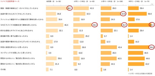 幼児期から始めた人は「家族がメイクをしていたから」の回答が最も多い。一方で、小学生以降から始めた人は「SNSでメイクの投稿を見て興味を持ったから」の回答が最も多く、SNSの影響力の強さが表れている。