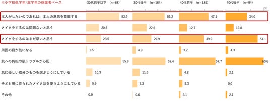 まずメイク品使用者/非使用者別で確認したところ、メイク品使用者の保護者の65.3%が「肌への負担や肌トラブルが心配」と回答しています。ただし、「本人の意思を尊重する」との回答が56.8%あり、心配しながらも本人のやりたいことを実現させている様子がうかがえます。一方、メイク品非使用者の保護者の41.5%は「メイクをするのはまだ早いと思う」と回答しており、メイク品使用者の保護者と比較して+22.9ptsという結果から、やや否定的な様子がうかがえます。