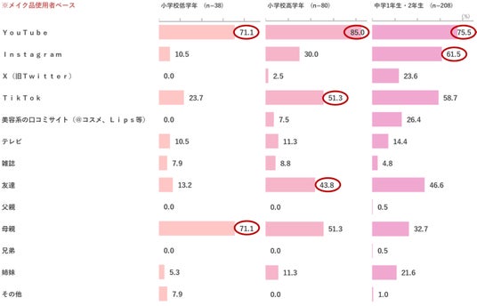 メイクに関する情報について、どの学齢でも「YouTube」から入手していると回答した割合が最も多いです。小学校低学年では「母親」から情報を得ていると回答した割合も多く、小学校高学年になると「友達」からの情報も増加します。YouTube以外のSNSでは、小学校高学年は「TikTok」、中学1年生・2年生は「Instagram」が最も多い結果となりました。