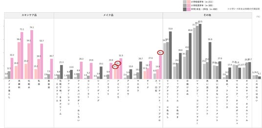 使用率の推移を確認すると、スキンケア品は小学校高学年で大きく増加し(低学年+29.7pts )、メイク品は中学生になると使用率が大きく伸びています。 (高学年+19.2pts )。