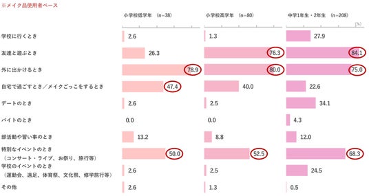 メイクをするシーンについて、小学校低学年は「外に出かけるとき」が最も多く、次いで「特別なイベントのとき」「自宅で過ごすとき/メイクごっこをするとき」が続く。小学校高学年では「外に出かけるとき」が最も多く、次いで「友達と遊ぶとき」「特別なイベントのとき」の順。中学1年生・2年生では「友達と遊ぶとき」が最も多く、2番目以降は「外に出かけるとき」「特別なイベントのとき」。