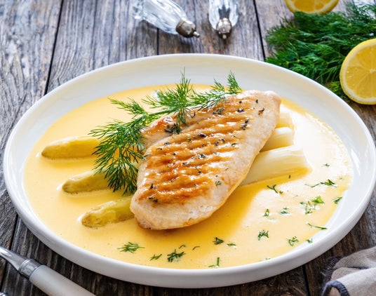 ドイツの春野菜を代表するホワイトアスパラガスと白身魚を添え