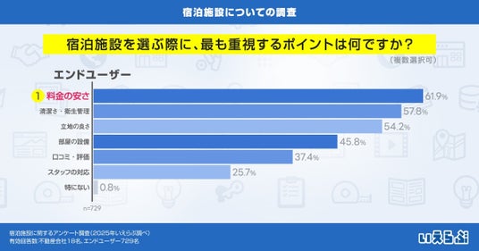 また、「宿泊施設を選ぶ際に、最も重視するポイントは何ですか?」という質問には「料金の安さ」(61.9%)が最も多く、次いで「清潔さ・衛生管理」(57.8%)、「立地の良さ」(54.2%)となりました。