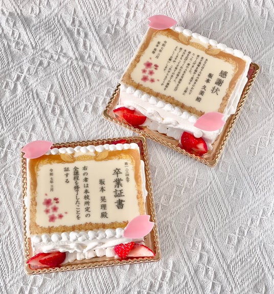左下が「卒業証書deデコレーションケーキ」、右上が新登場した「感謝状ケーキ」