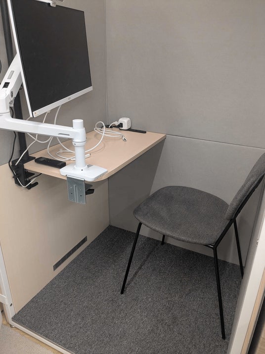 優れた遮音性を持つ可動式防音ブースで、Web会議や集中作業に最適です。工事不要で導入可能で、換気システムも完備。不特定多数の方が利用できるよう、室内には除菌スプレーもご用意しております。