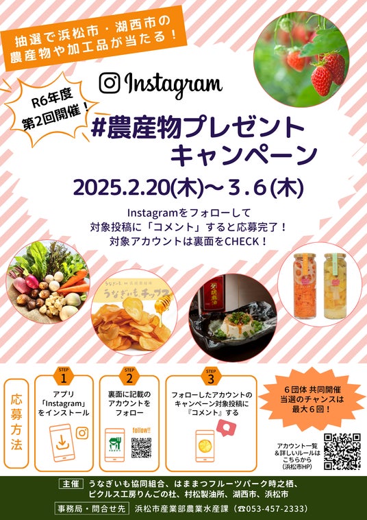 「浜松市」が運営するインスタグラムアカウント“はまのう”と、「湖西市」及び市内4団体が共同で、浜松・浜名湖地域の農産物等が当たるプレゼントキャンペーンを実施しています。