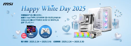 この度、エムエスアイコンピュータージャパン株式会社は、2月24日(月)より、「Happy White Day2025 キャンペーン」を開催いたします。対象製品を単品購入するとMPG 321URXW QD-OLEDが抽選で当たる!
