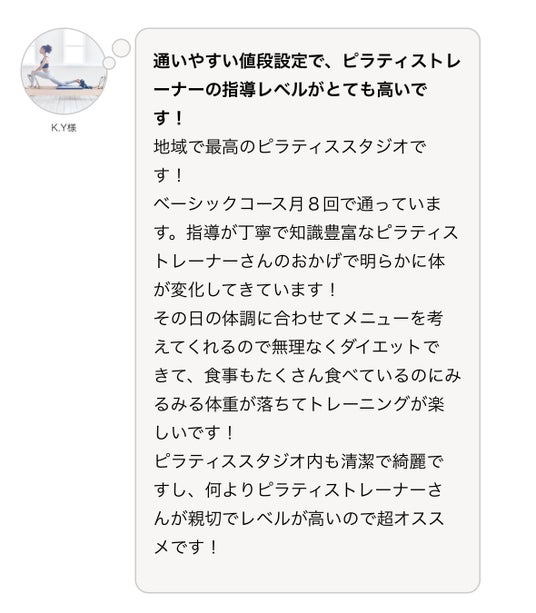他のピラティスジムだとトレーニングだけだったので、プロに体のことや食事の面、考えてもらいながら伸ばしてもらえるのがありがたいです。