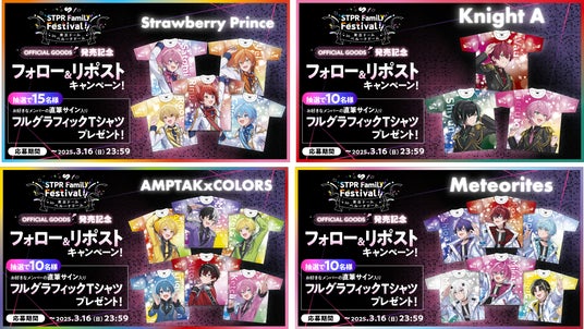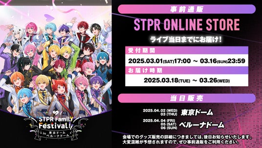 株式会社STPR (本社:東京都渋谷区 代表:柏原 真人、以下STPR)は、「すとぷり」「Knight A - 騎士A -」「AMPTAKxCOLORS」「めておら - Meteorites -」など、所属のクリエイターが集結する大型ライブフェス『STPR Family Festival!!』の新情報として、オフィシャルグッズ・握手会(事前通販限定企画)・各公演のサブタイトル・DAY3(4月4日) ベルーナドーム公演スポーツデイの競技内容についてお知らせいたします。なおオフィシャルグッズは、2025年3月1日(土)からSTPR ONLINE STOREにて【事前通販】受付を開始いたします。