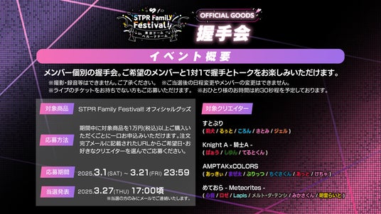 2025年3月1日(土)から3月16日(日)までSTPR ONLINE STOREで発売される『STPR Family Festival!!』オフィシャルグッズを、1万円(税込)以上ご購入いただくごとに1口のお申込みが可能です。STPR ONLINE STOREの注文完了メールに記載されるURLより応募フォームを開いて、希望日と好きなクリエイターなど必要事項をご入力の上、ご応募ください。当選者はSTPR Family Festival!!の終演後、応募時にお選びいただいたクリエイターと1対1で握手&トークをお楽しみいただけます。ご応募お待ちしております!