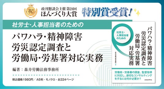 株式会社労働新聞社(本社:東京都板橋区、代表取締役社長:森川泰孔)発行の書籍『社労士・人事担当者のためのパワハラ・精神障害労災認定調査と労働局・労基署対応実務』(森井労働法務事務所 編著)が、政刊懇談会主催・第24回「ほんづくり大賞」において、特別賞を受賞しました。